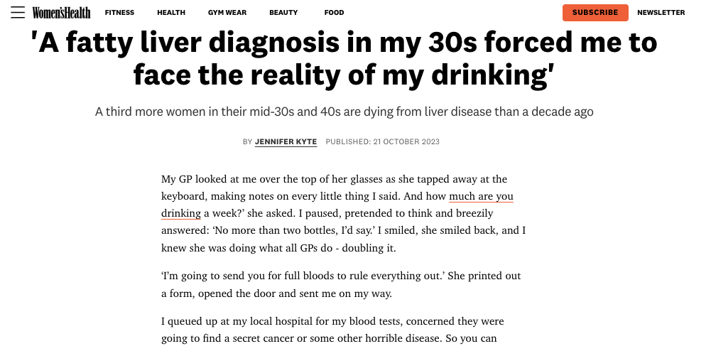 A fatty liver diagnosis in my 30s forced me to face the reality of my drinking January 5, 2024 Share this: Click to share on Facebook (Opens in new window) Facebook Click to share on X (Opens in new window) X Like Loading...