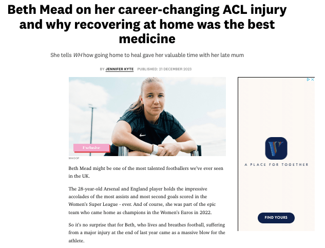 Beth Mead on her career-changing ACL injury and why recovering at home was the best medicine January 5, 2024 Share this: Click to share on Facebook (Opens in new window) Facebook Click to share on X (Opens in new window) X Like Loading...